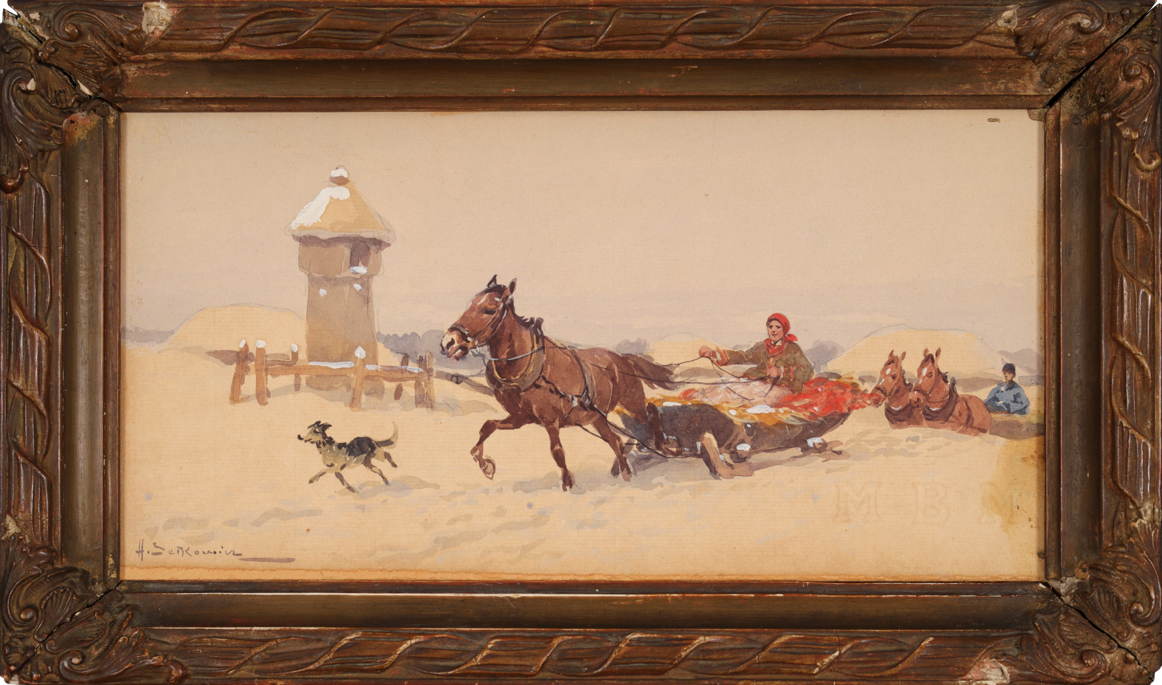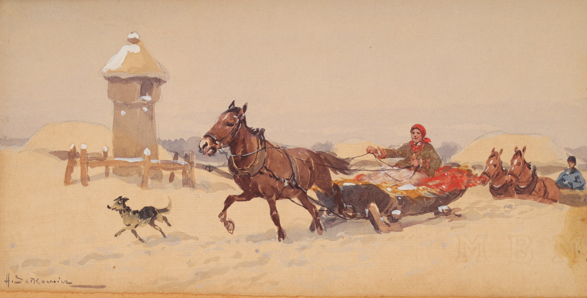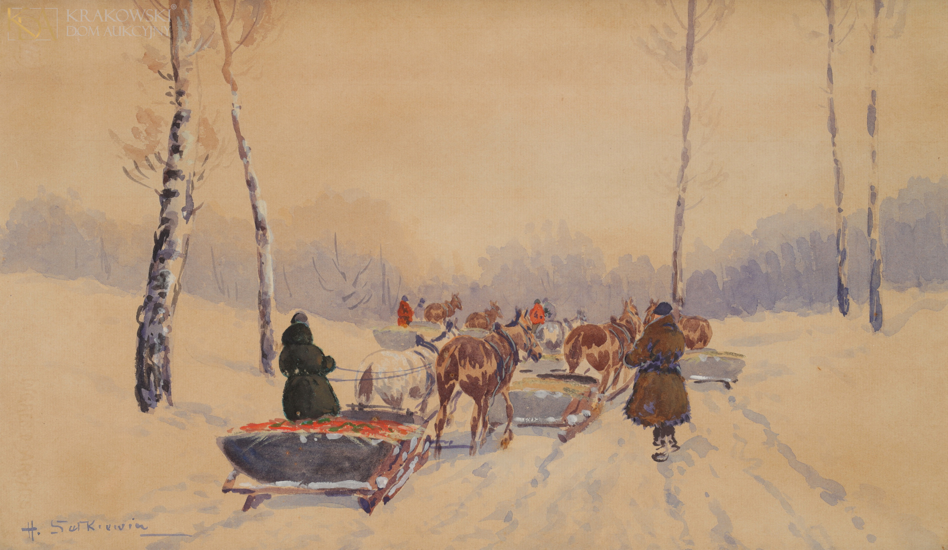| Sygnowany l.d.: "A. Setkowicz" OPIS PRACY: Obraz podejmuje popularny w malarstwie Adama Setkowicza motyw sań jadących po zasypanej śniegiem drodze. W centrum kompozycji znajdują się widoczne od tyłu duże drewniane sanie zaprzężone w parę koni. Podróżnikami są w tym przypadku mężczyzna i leżący u jego boku pies. Ubrana w kożuch postać jest obrócona tyłem w kierunku jazdy i patrzy w stronę widza – coś musiało zwrócić uwagę mężczyzny. Można mniemać, że jest to celowy zabieg artystyczny sytuujący odbiorcę w roli podróżnika kolejnych sań. W oddali, jakby za mgłą czy zamiecią sypiącego śniegu, znowuż widnieje parokonka. Adam Setkowicz w znamienny dla siebie sposób ukazał zaprzęg w ruchu, w charakterystycznym dla swojej twórczości widoku od tyłu. Wspomniany już, widoczny w tle rozbielony zarys drugich sań, sprawia, że całe przedstawienie zyskało głębię. Obraz został osadzony w śnieżnobiałej scenerii wysokich zasp. Ukazany krajobraz stał się dla Adama Setkowicza polem do popisu w zakresie malarskiej wrażliwości na światło i kolor. Delikatne przejścia pomiędzy bielą, szarością i błękitem wpływają na charakter całości, który trafnie oddaje aurę mroźnego zimowego dnia. | |