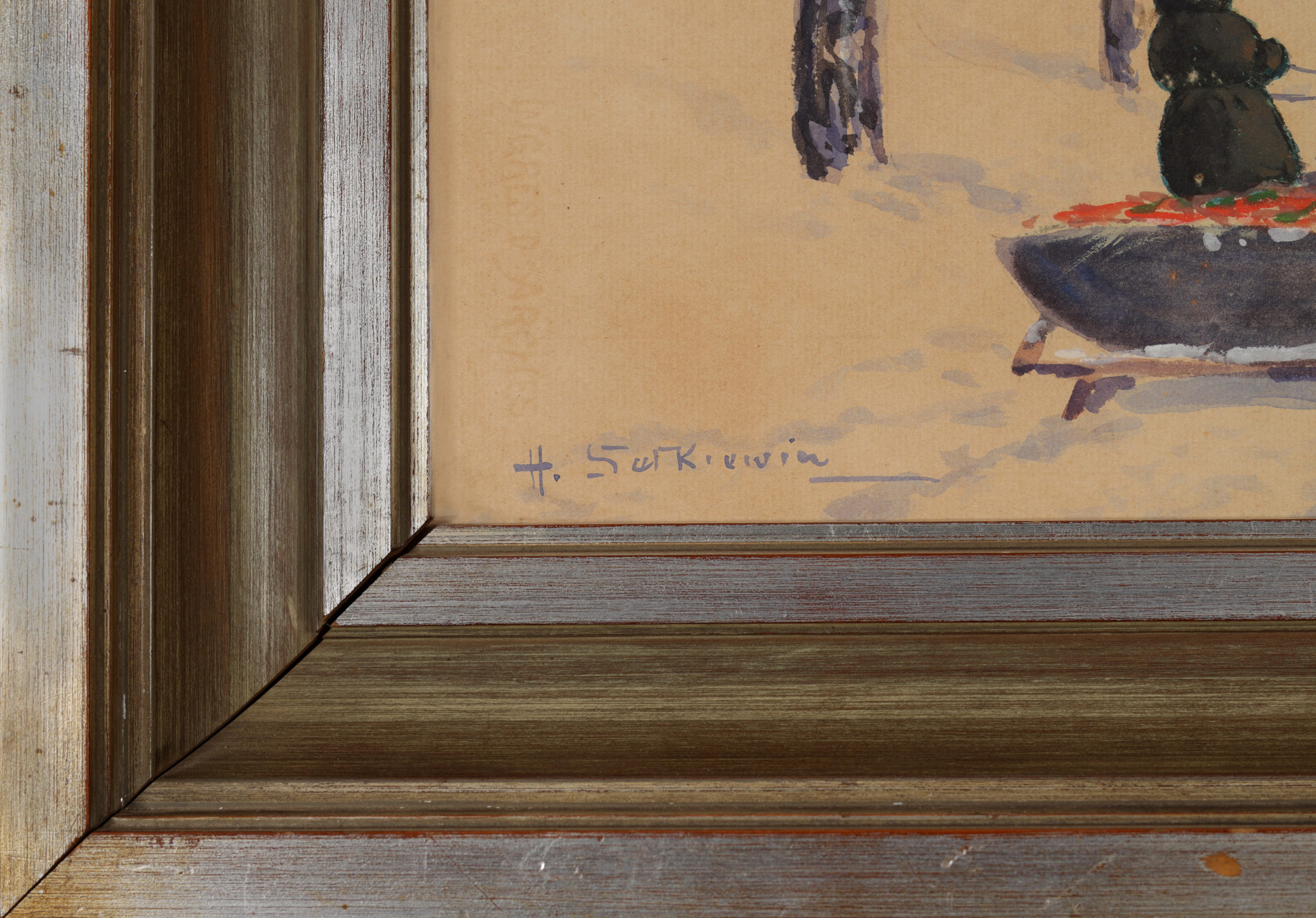 Lokalnie widoczne drobne ubytki malatury (l.d.). OPIS PRACY: Adam Setkowicz jest znany jako twórca sielankowych wiejskich scen rodzajowych. Malarz najchętniej ukazywał realia podkrakowskich miejscowości. W tworzonych przez niego kompozycjach wielokrotnie powracał motyw końskich zaprzęgów. W prezentowanej pracy w centrum pola obrazowego został przedstawiony krakowski orszak weselny, który wyraźnie odcina się od bieli pokrytego śniegiem otoczenia. Wąska gama barwna jest zdynamizowana kolorowymi strojami rozbawionych weselników, w których dominują akcenty czerwieni. Obraz stanowi charakterystyczny dla tego twórcy przykład zimowej kompozycji, która w szczery sposób oddaje lokalny folklor. | |