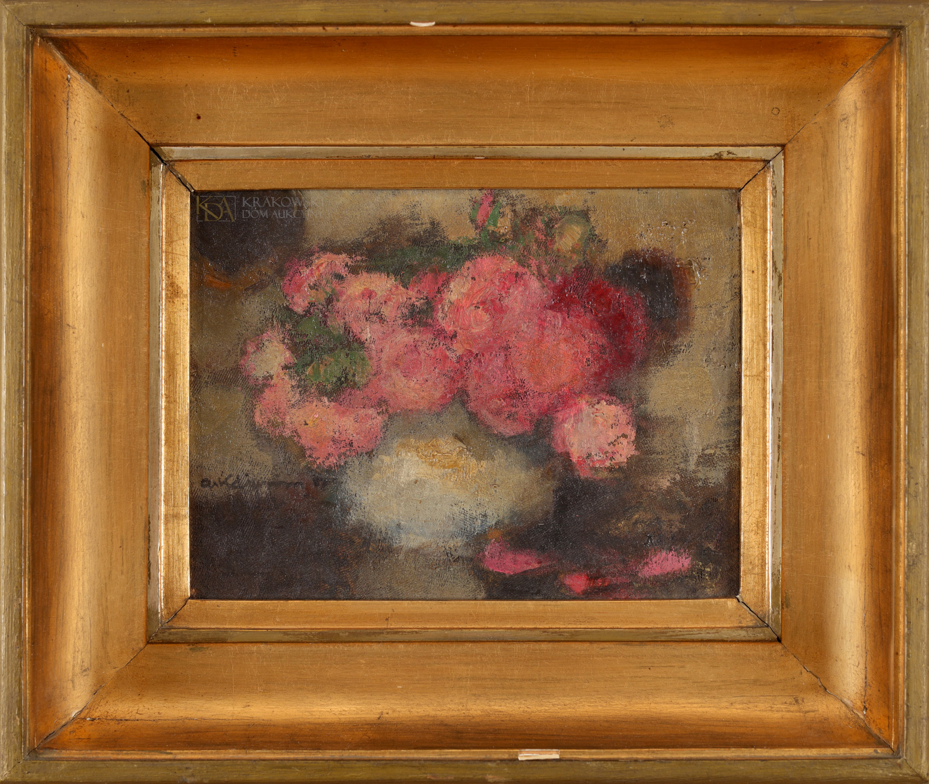 Praca została sprzedana w ofercie poaukcyjnej. OPIS PRACY: Alfons Karpiński był krakowskim malarzem, znanym jako twórca nastrojowych, dekoracyjnych obrazów o secesyjnym charakterze. Dużym uznaniem, już za życia artysty, cieszyły się malowane przez niego martwe natury z kwiatami. Oferowany obraz zawiera w sobie wiele charakterystycznych cech malarstwa Alfonsa Karpińskiego. Artysta wielokrotnie wykorzystywał motyw imponującego bukietu kwiatów, najczęściej właśnie róż, który jest umieszczony w jasnym porcelanowym wazonie. Realizmu pracom malarza dodają pojedyncze, opadłe na stół płatki kwiatów. Ukazanie w tle fragmentów obrazów w złotych ramach również wielokrotnie powracało w tłach jego prac i stanowiło wysmakowane rozświetlenie kompozycji – błysk ram korespondował bowiem zazwyczaj z jakimś złotym przedmiotem usytuowanym obok wspomnianego już bukietu. Realistyczna na swój sposób konwencja przedstawienia w twórczości Alfonsa Karpińskiego łączy w sobie malarskie kształtowanie form, płynny kontur, pastelową, opartą jednak przy tym na kontrastach gamę barwną i interesujące zabiegi światłocieniowe. | |