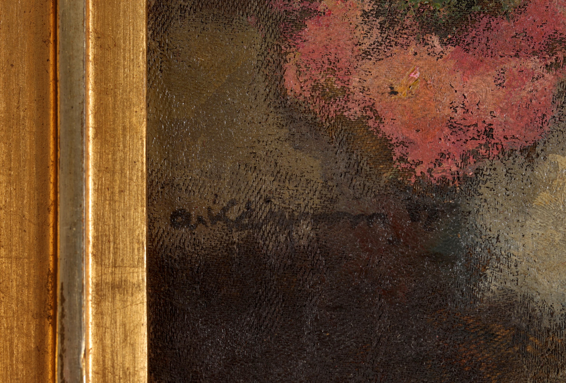 | Sygnowany l.d.: "A. Karpiński" (sygnatura słabo widoczna) OPIS PRACY: Alfons Karpiński był krakowskim malarzem znanym jako twórca kobiecych portretów i martwych natur, które już za jego życia zyskały uznanie wśród wielu kolekcjonerów. W oferowanym obrazie artysta zastosował rozbudowaną fakturę malarską i znamienny dla swojej twórczości, lekko rozmyty kontur. Gama barwna całości jest stonowana i ciepła, przełamana chłodem bieli kwiatów. W centrum kompozycji znajduje się donica z krzewem hortensji, który wyraźnie odcina się od jednolitego jasnobrązowego tła. W prawym dolnym rogu znajdują się z kolei trzy różnokolorowe jabłka, które, wraz z odgiętą na lewo łodygą z kwiatem, dynamizują całą kompozycję. "Martwa natura z hortensją" jest dziełem wyjątkowym w kontekście twórczości Alfonsa Karpińskiego, artysta rzadko bowiem wykorzystywał wyraźnie wertykalne, wąskie pola obrazowe. Nietypowy, a przez to bardzo ciekawy jest również motyw hortensji, wyróżniający się na tle częstych w malarstwie Alfonsa Karpińskiego kompozycji z różami. | |
