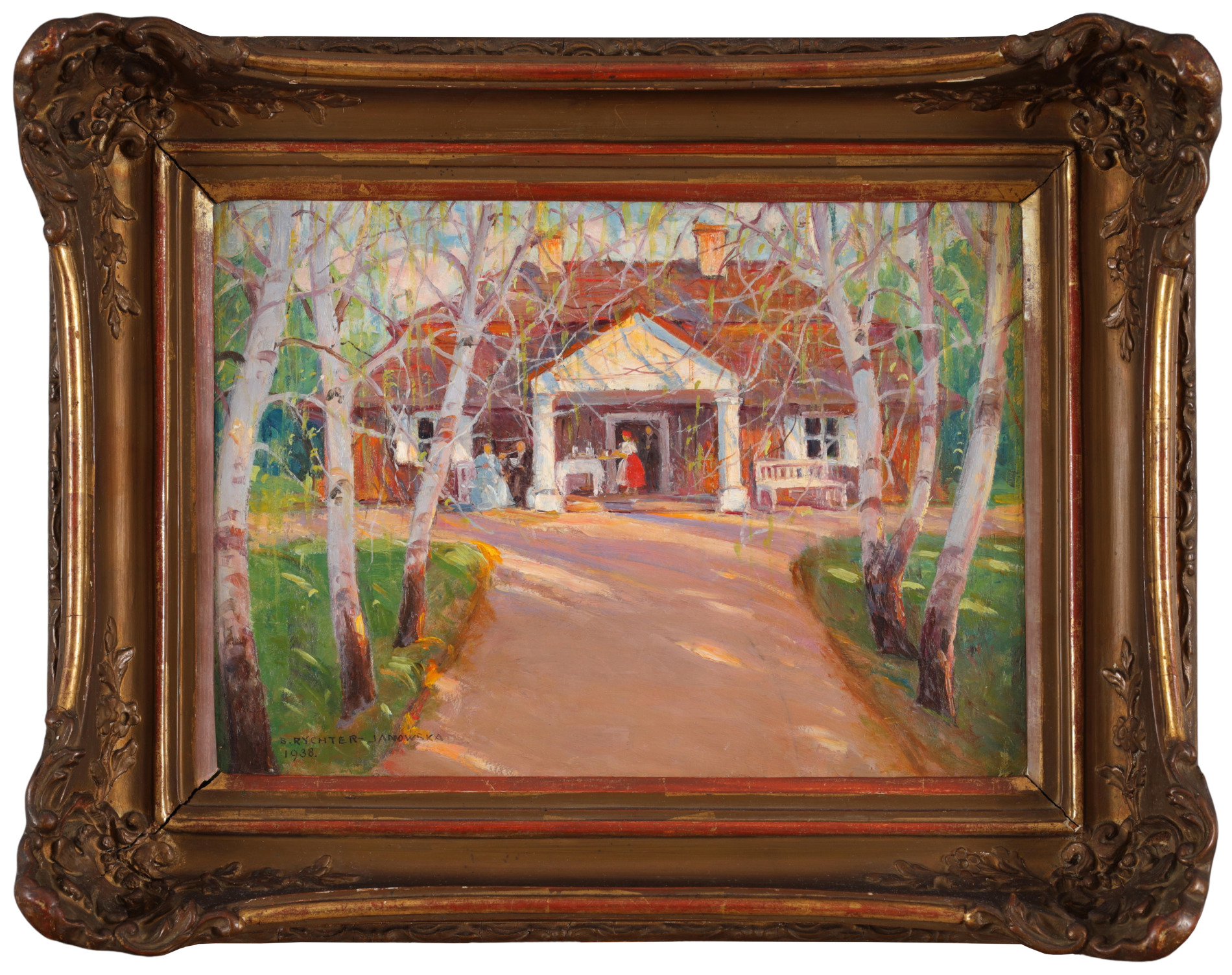 | sygnowany l.d.: "B. RYCHTER-JANOWSKA" opis pracy: Szlachecki dworek polski był jednym z ulubionych tematów niewielkich obrazów malowanych po 1900 roku przez Bronisławę Rychter-Janowską. Dworki te artystka ujmowała z różnych perspektyw, w urozmaiconym otoczeniu, o zmiennych porach dnia i roku. Niekiedy, tak jak w prezentowanej pracy, Rychter-Janowska uzupełniała kompozycję sztafażem. Na obrazie artystka ukazała typowy biały dworek polski, z którego wychodzą dwie postacie, aby przywitać nadchodzącą kobietę z dzieckiem. Pierwszy plan i tło wypełnione są bujną roślinnością. Malarka interesowała się również specyfiką oświetlenia. Tutaj mistrzowsko ujęła złociste światło późnego lata. | |