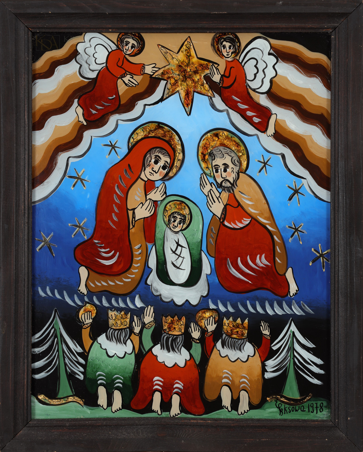 | Sygnowany i datowany p.d.: "EPęksowa | 1977" Opisany na odwrocie: "Ewelina Pęksowa | Zakopane 1977" OPIS PRACY: Ewelina Pęksowa jest jedną z najbardziej rozpoznawanych polskich malarek-prymitywistek. Artystka była związana z podhalańskim środowiskiem artystycznym. Tworzyła prace na szkle, poruszając tematykę religijną i rodzajową. Oferowany obraz przedstawia obecną od wieków historii sztuki zaczerpniętą z Ewangelii wg św. Łukasza (Łk 5, 1-11) scenę cudownego połowu ryb i powołania Apostołów. W sposobie ukazania tematu widoczne są wpływy wierzeń i mentalności ludowej, nie tylko w samej dekoracyjności ujęcia (złota farba, upstrzone gwiazdami niebo, anioły flankujące kompozycję w górnej części), ale też w postaci Jezusa namalowanego w pozie rzucającego zaklęcie czarodzieja. W prezentowanej pracy są wyraźnie dostrzegalne unikalne cechy stylu Eweliny Pęksowej. Poszczególne elementy całości zostały zbudowane za pomocą uproszczonych form wypełnionych czystą plamą barwną. Kompozycja jest wielopostaciowa i została podporządkowana symetrycznemu układowi. Obraz cechuje dekoracyjna wielobarwność i swoboda w ukazaniu religijnego tematu. | |