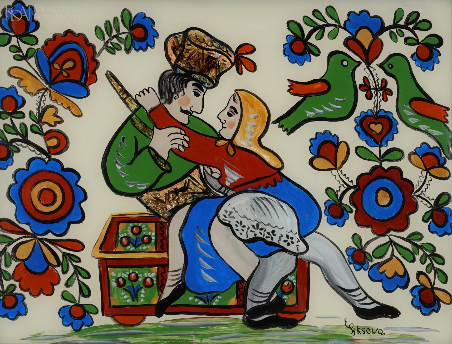 | Sygnowany i datowany p.d.: "EPęksowa | 1984" Opisany na odwrocie: "Ewelina Pęksowa | Zakopane"; "Wygnanie z Raju" OPIS PRACY: W swojej twórczości Ewelina Pęksowa często podejmowała tematykę religijną, malowała Madonny, anioły, postacie świętych i sceny biblijne. Samodzielnie ukształtowała swój indywidualny styl, który czerpał inspiracje z dawnego malarstwa ludowego. Artystka w fantazyjny sposób interpretowała tradycyjne tematy, ukazując je w nowy i innowacyjny sposób. Podejmując starotestamentowy motyw wygnania z Raju, malarka stworzyła kompozycję, w której znana ikonografia została przetworzona w zupełnie nową formę. Artystka ukazała postacie i elementy tradycyjnie związane z tym tematem, jednak to nie Adam i Ewa stanowią główny element całości, lecz monumentalny anioł będący reprezentację boskiej siły. Ta niebiańska istota staje tutaj pomiędzy wężem-szatanem, a przestraszoną parą ludzi, broniąc jak gdyby tych ostatnich przed złem, na co wskazuje miecz przebijający ciało syczącego węża. Dzięki takiemu przedstawieniu biblijna historia tragedii i upadku człowieka zyskuje wydźwięk pozytywny, staje się źródłem nadziei, głosi chwałę Boga, który przez swoich wysłanników stara się ochronić ludzkość przed siłami zła. Wiara w boską dobroć i przychylność aniołów, zwłaszcza w kontekście Anioła Stróża, jest częsta w religijności duchowej, jednak ujęcie tematu w tak nietypowy sposób świadczy o ogromnej inwencji twórczej, która cechowała Ewelinę Pęksową. Formalnie w pracy są obecne charakterystyczne dla artystki środki artystycznego wyrazu, takie jak delikatny, cienki kontur, nasycona płaska plama barwna i ceniona wśród kolekcjonerów obecność złotej farby. | |