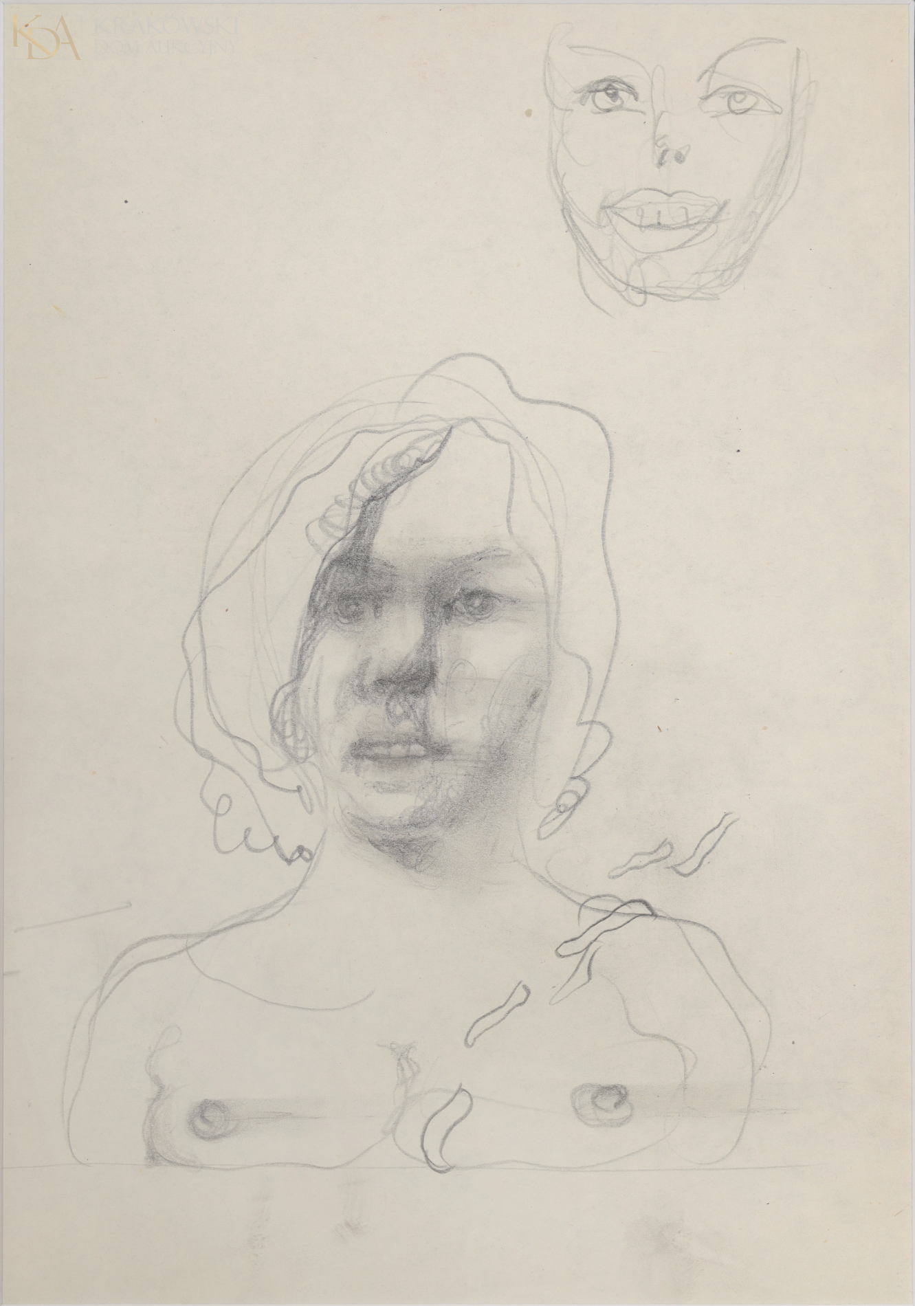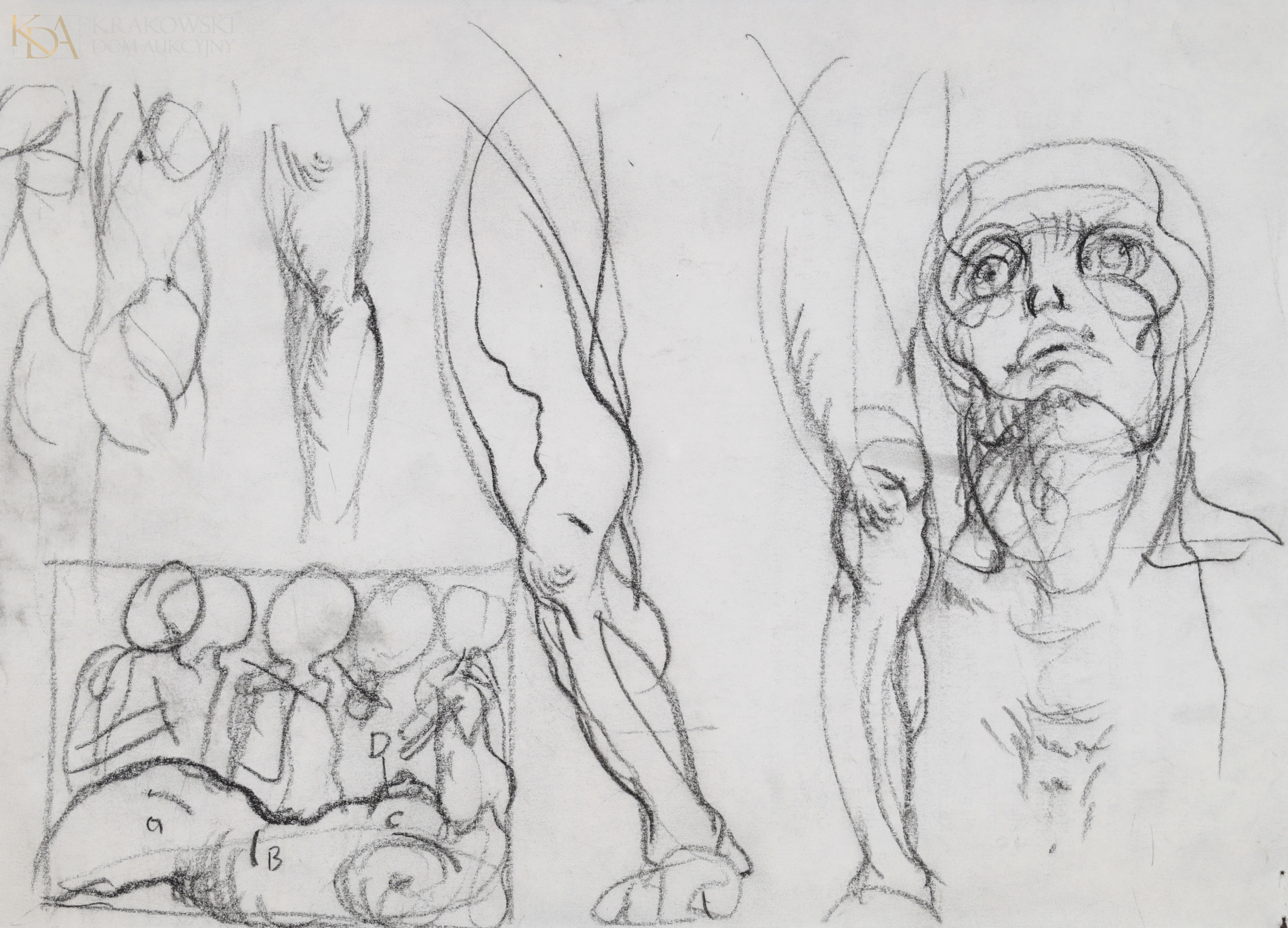 | Na stronie ze studiami śr.g. okrągła pieczątka "Z rysunków Franciszka Starowieyskiego" z monogramem wiązanym. Do rysunku dołączony certyfikat autentyczności wydany przez syna artysty - Jana Mikołaja Biberstein-Starowieyskiego. PRACA NIEDOSTĘPNA | |
