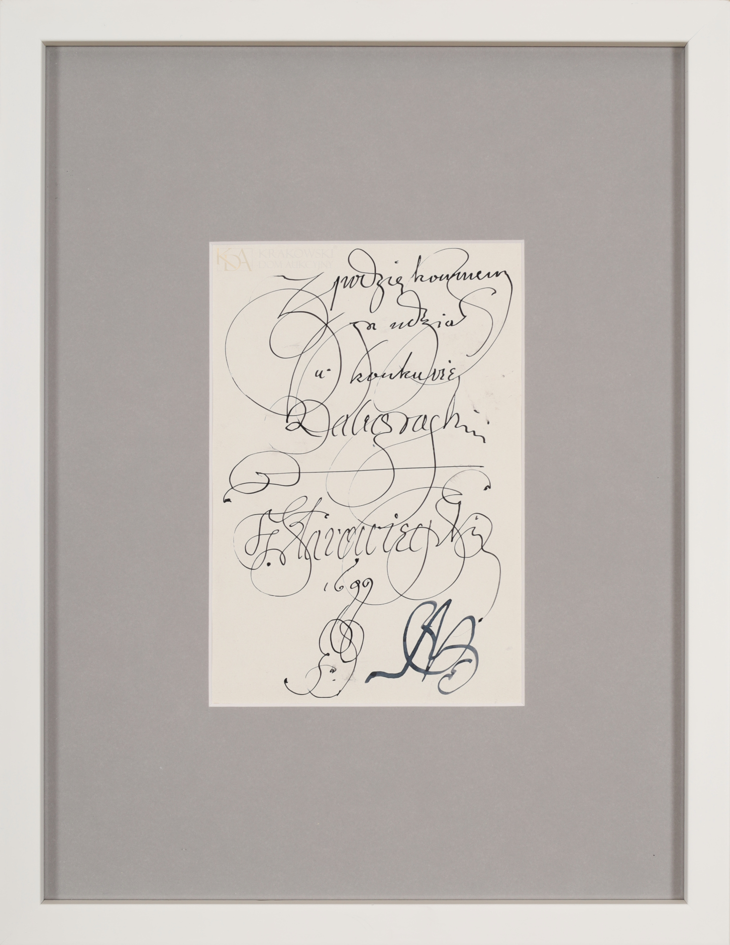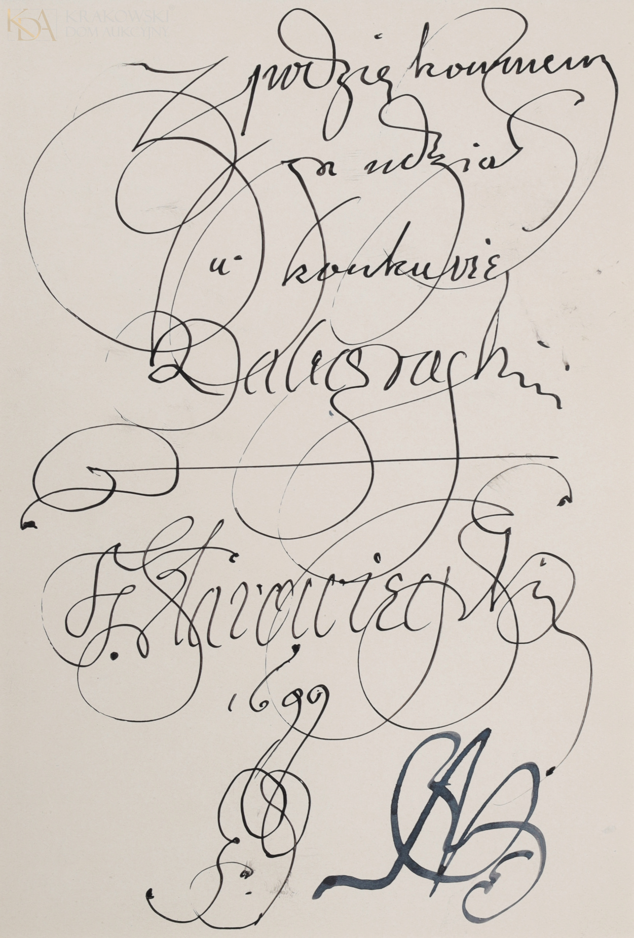 | Sygnowany i datowany śr.d.: "F. Starowieyski | 1699" Na odwrocie szkice kaligraficzne. Do pracy dołączony certyfikat autentyczności wydany przez syna artysty - Jana Mikołaja Biberstein-Starowieyskiego. | |