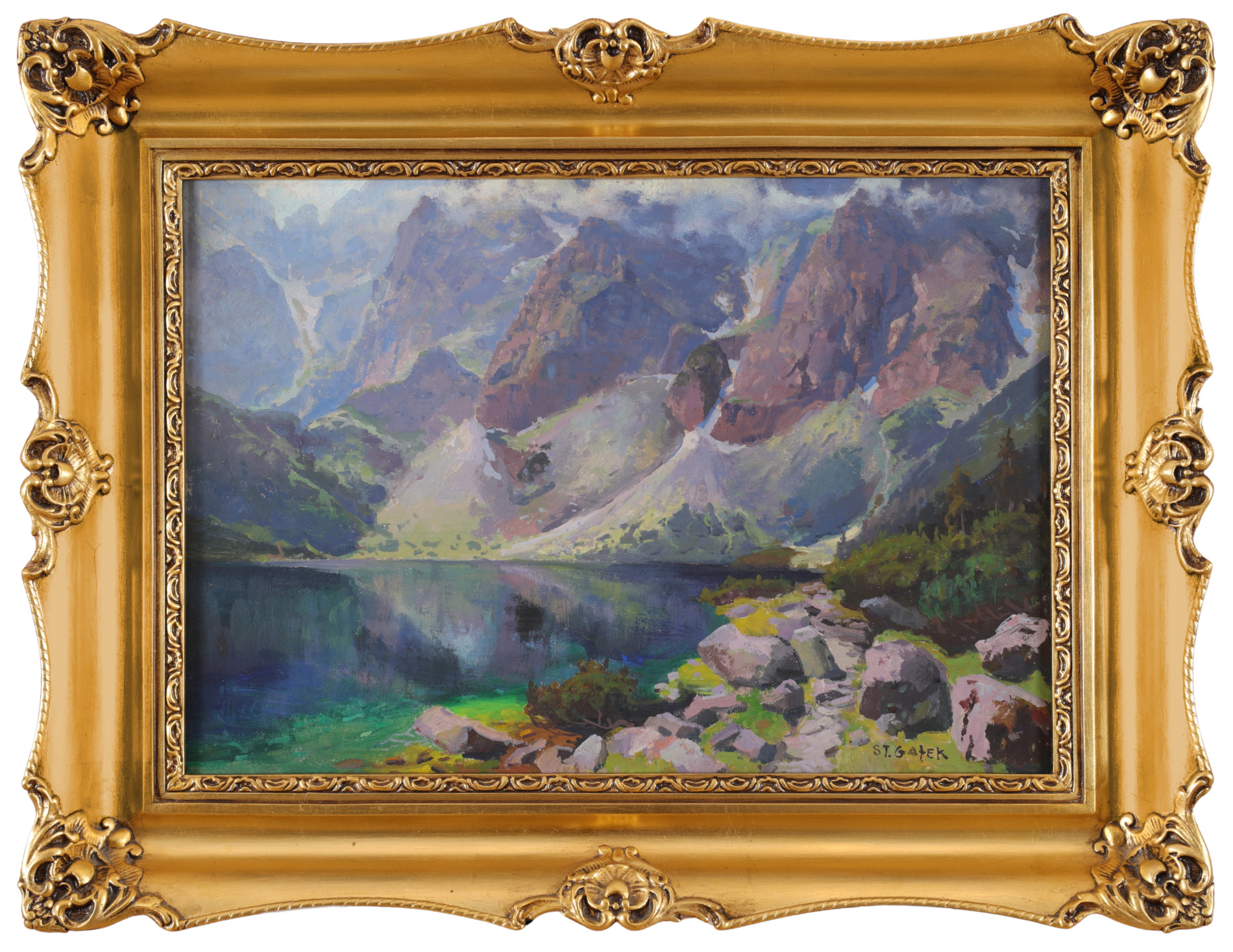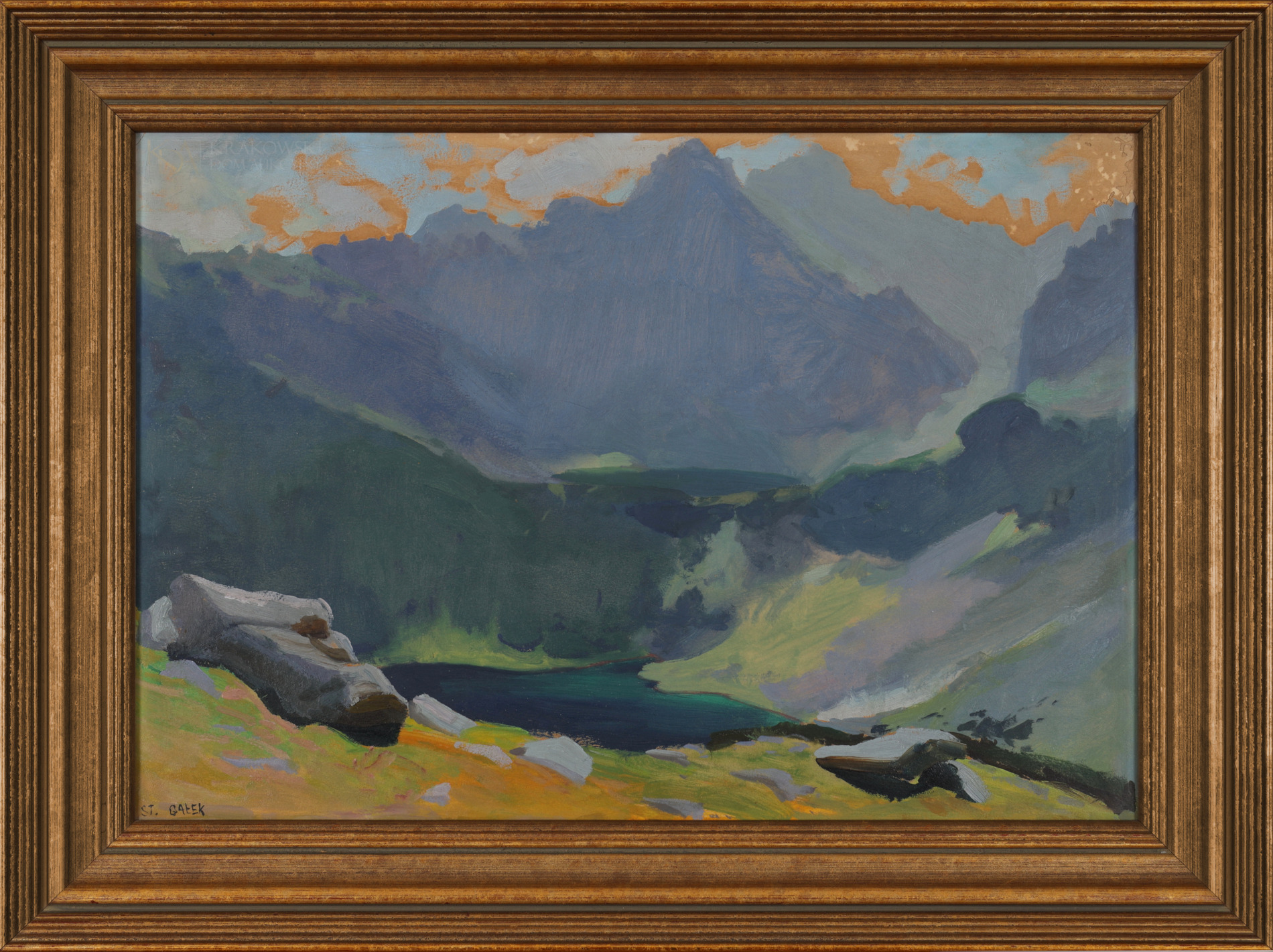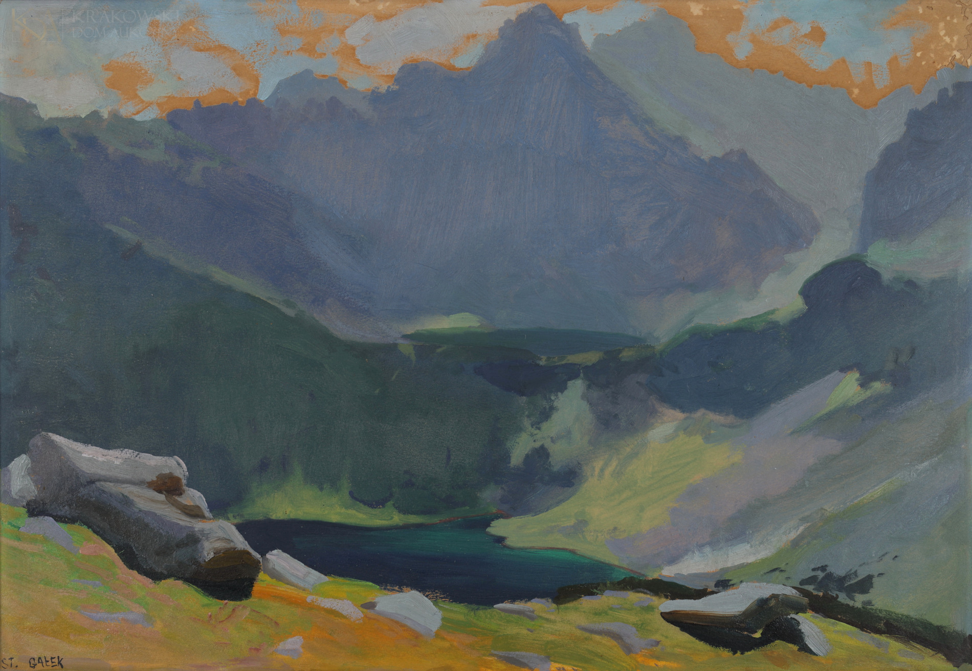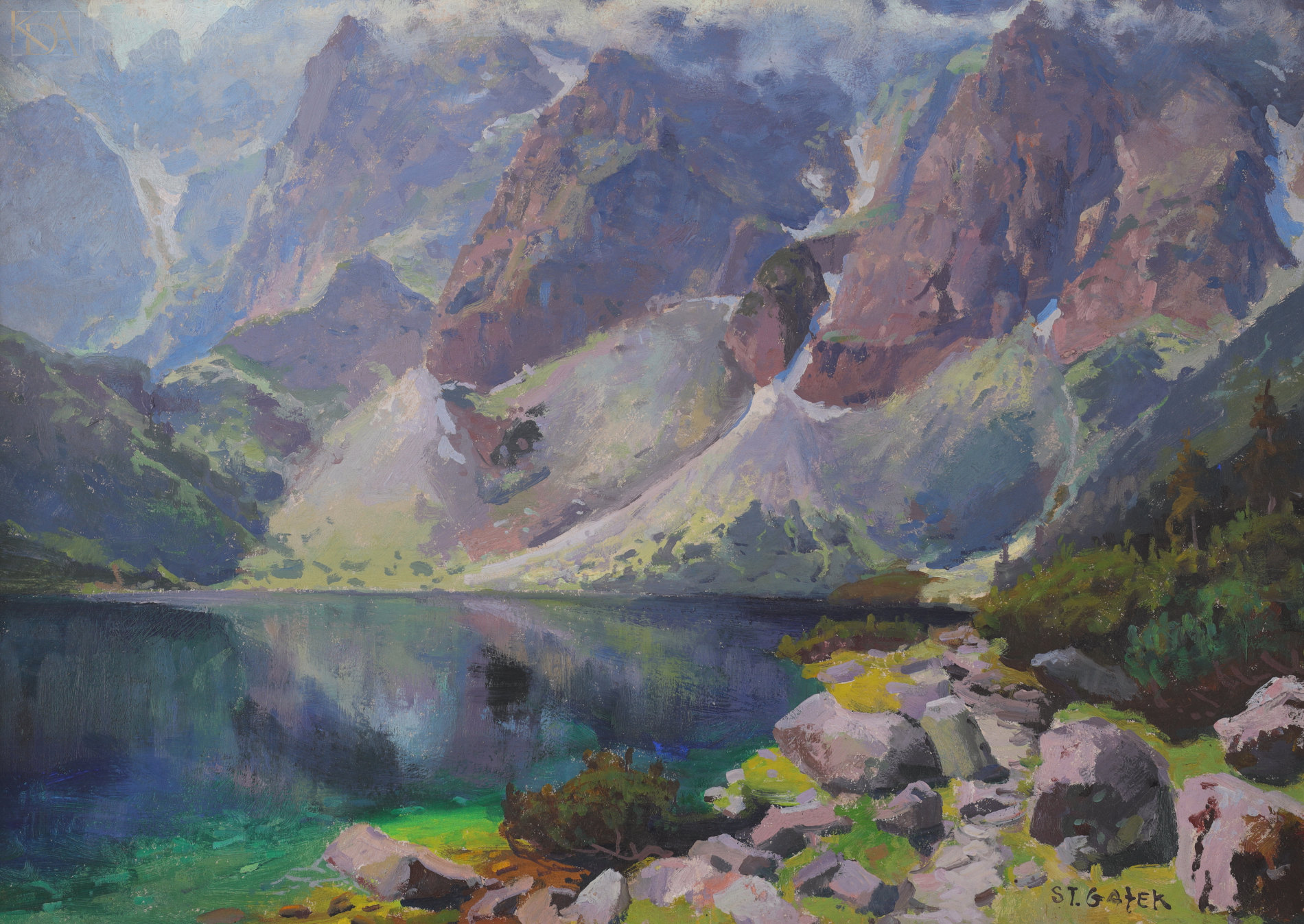 OPIS PRACY: Twórczość Stanisława Gałka to przede wszystkim pejzaże Tatr i Podhala, ujmowane wprawną ręką artysty, który większość swojego życia związał z Zakopanem i obcował z górami na co dzień. Widok na jedno z najsłynniejszych tatrzańskich jezior – Morskie Oko – był jednym z ulubionych motywów malarza. Stanisław Gałek Morskie Oko przedstawiał wielokrotnie, w różnej pogodzie i porach, najbardziej upodobał sobie jednak mglisty pejzaż rześkiego dnia, kiedy to woda przyjmuje najgłębsze odcienie błękitu, a górskie szczyty oplata subtelnie mgła. Do tego typu przedstawień należy również oferowany obraz z 1921 roku. Artysta znakomicie oddał w nim kolorystykę Morskiego Oka: zielonkawego przy brzegu, granatowego w oddali. Dobrze ujęta została również perspektywa – pokaźny kamień na pierwszym tle stanowi wyraźny akcent kompozycyjny, a jednocześnie punkt odniesienia, dzięki któremu odczuwalny jest monumentalizm i majestatyczność skał w tle.