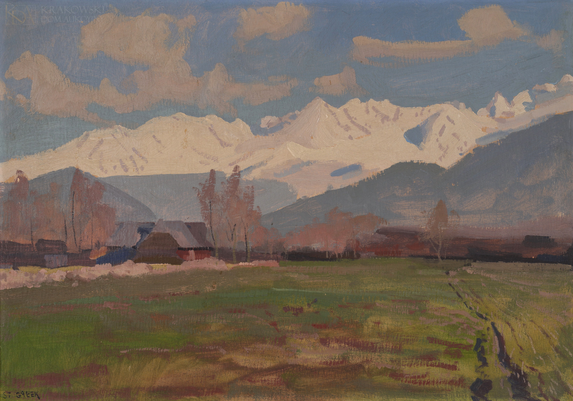 | sygn. l.d.: „ST.GAŁEK | 1950” na odwrocie ołówkiem: „St. Gałek | Dolina Kościeliska "Pisana", szałas" OPIS PRACY: Stanisław Gałek był uznawany za jednego z najlepszych malarzy Tatr okresu międzywojennego. Jego obraz „Polana Pisana w Dolinie Kościeliskiej” przedstawia Górali wypasających owce na tytułowej hali. Zarówno regionalny strój Podhalan, jak i figury owiec, mimo swobodnego sposobu malowania, zostały dobrze zaobserwowane i przedstawione. Kompozycja obrazu jest wyważona, a jej ciężar skupiony został po zacienionej lewej stronie, zamkniętej widocznym fragmentem charakterystycznej góralskiej chaty. Stosunkowo jasna gama barwna i impresjonistycznie ujęty światłocień znakomicie oddają ciepło słonecznego, wiosennego dnia w Tatrach. | |