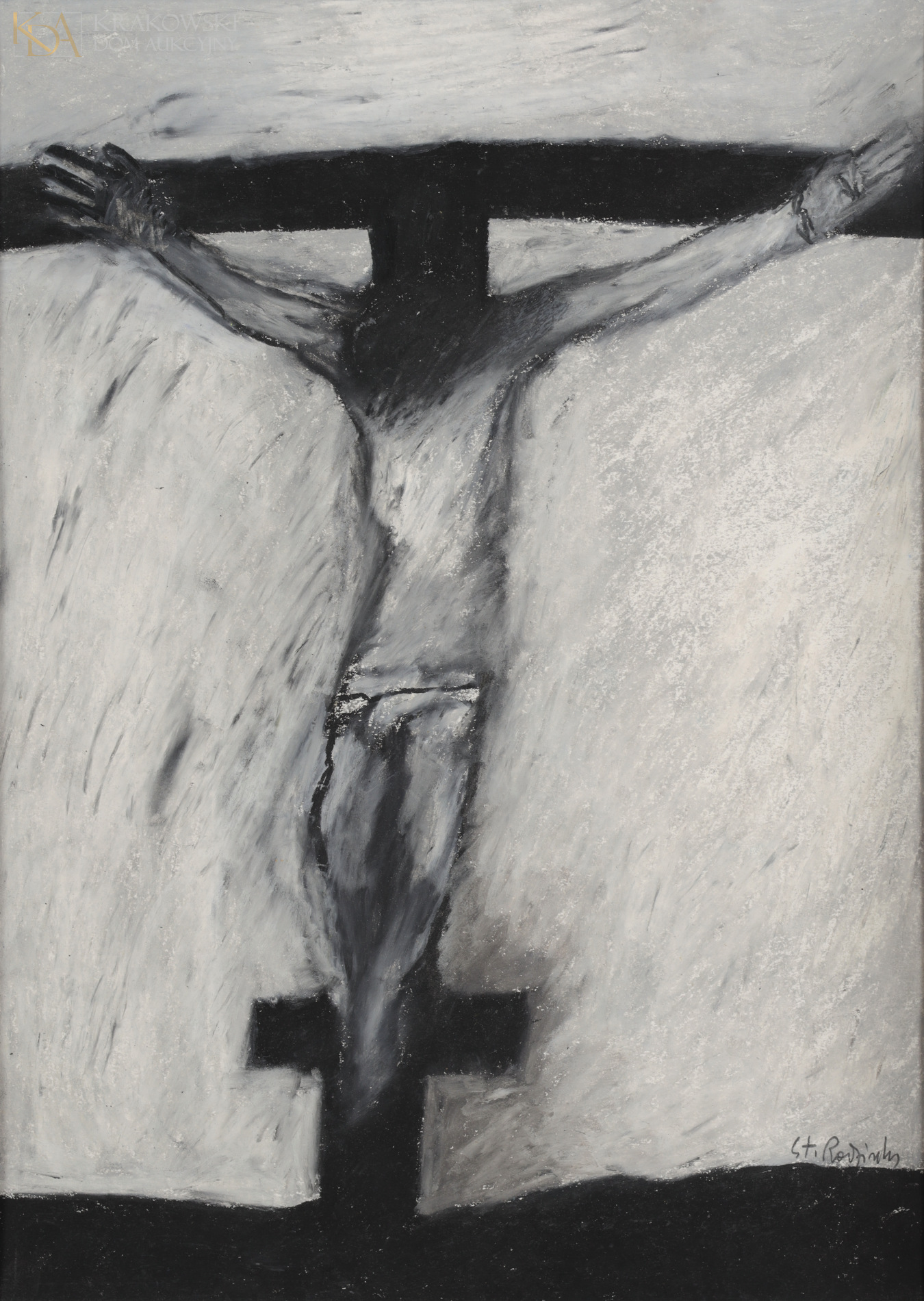 | na odwrocie autorski opis: "ST. RODZIŃSKI | POD KRZYŻEM I | 2009-2010- | 2012-2013" opis pracy: Praca Stanisława Rodzińskiego przedstawia scenę rozgrywającą się pod krzyżem Chrystusa. Po jego lewej stronie stoi Maria, której głowę artysta otoczył nimbem jasności. Po prawej, u stóp krzyża, klęczy odziana w czerwone szaty Maria Magdalena. Obraz posiada zróżnicowaną fakturę, tworzoną przez liczne impasty. Ciemna kolorystyka i czerwone akcenty ran Jezusa i sukni świętej wzmagają nastrój boleści, powagi i skupienia. Malarstwo o tematyce pasyjnej jest głównym nurtem twórczości Stanisława Rodzińskiego. Wyraża jego wiarę i światopogląd, jest refleksją artysty na temat cierpienia i przemijania. | |