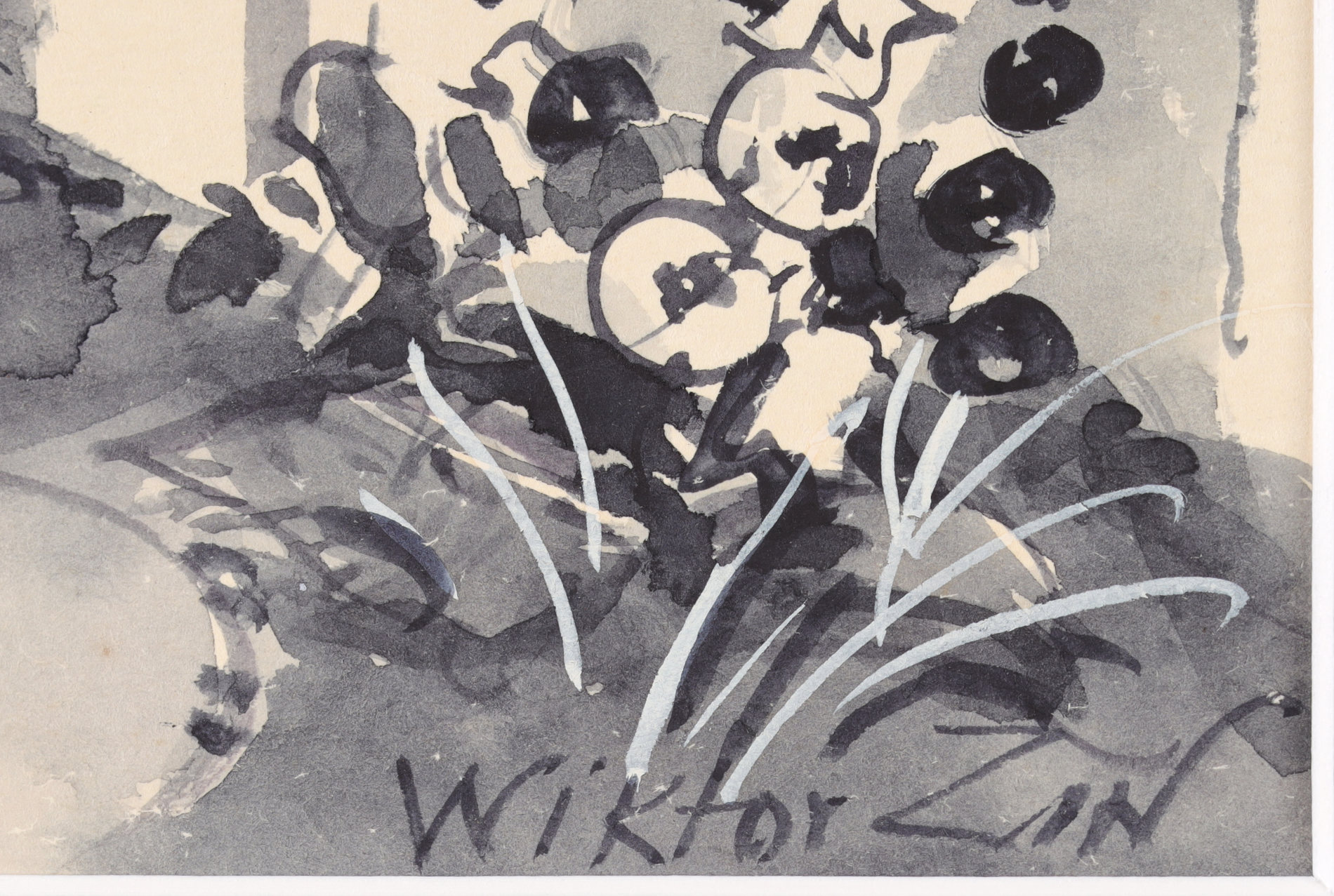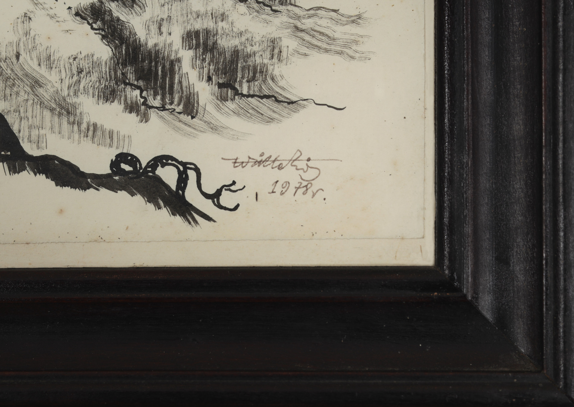 | Sygnowany p.d. monogramem "ZW" oraz datowany "1944" Opisany l.g.: "Szkic do oleju przeprawa przez rzekę" oraz l.d.: "WRZESIEŃ SZKIC 116" Na papierze widoczny foxing. OPIS PRACY: Wiktor Zin jest jedną z najbardziej rozpoznawalnych postaci polskiej kultury. Znany szerokiej publiczności, m.in. z telewizyjnych programów edukacyjnych takich jak "Piórkiem i węglem", przez dekady zachwycał widzów wrażliwością na dziedzictwo kulturowe. Uwagę miłośników malarstwa Wiktora Zina powinna zwrócić prezentowana praca, wykonana czarnym tuszem na papierze. Ukazuje ona niezwykle dynamiczną scenę przeprawy przez rzekę. Namalowana została w roku 1944, a więc we wczesnym okresie twórczości artysty, kiedy był on jeszcze studentem Wydziałów Politechnicznych w krakowskiej Akademii Górniczo-Hutniczej. Kompozycje z tego czasu należą do rzadkości na rynku sztuki, co czyni prezentowaną pracę wyjątkowo interesującą zarówno z perspektywy historycznej, jak i kolekcjonerskiej. | |