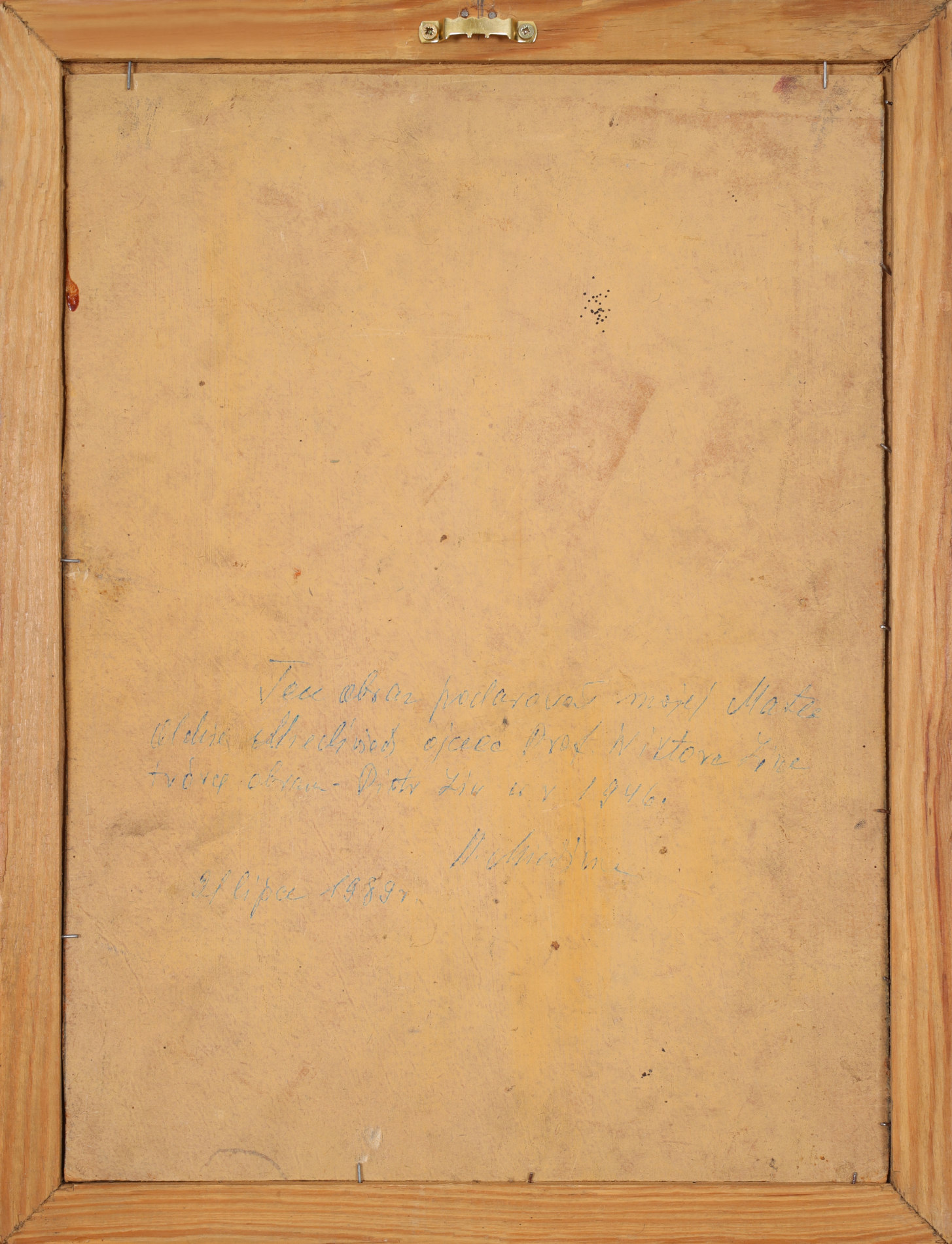 | Opisany na odwrocie: "Ten obraz podarował mojej Matce | [nieczytelne] ojciec Prof. Wiktora Zina | twórcy obrazu - Piotr Zin w r. 1946. | [nieczytelne] | 21 lipca 1989 r." Widoczne drobne ubytki malatury oraz ślad po zagięciu podłoża (l.d.). | |