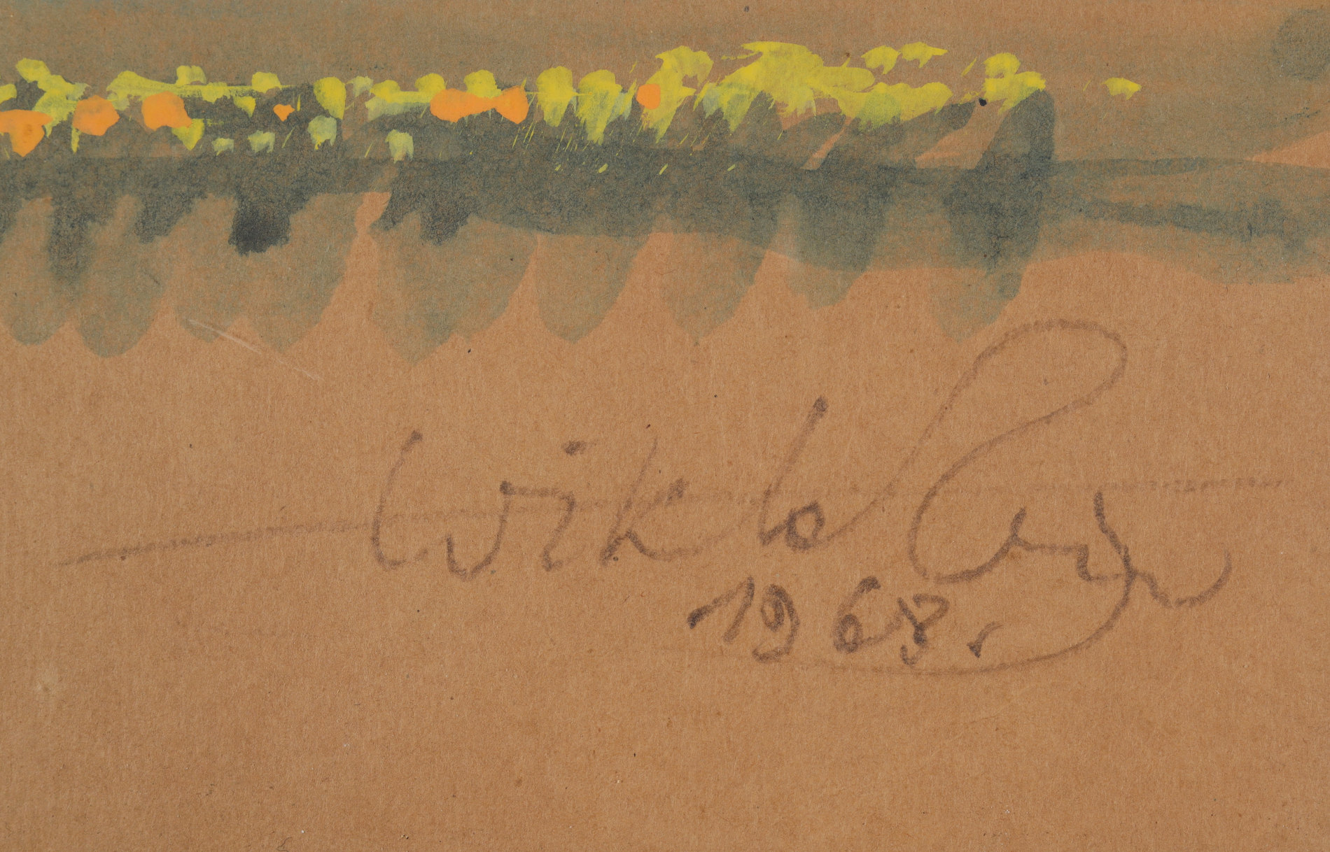 | L. d. dołączone trzy karty składające się na dedykację autorską (pod kartami widoczny nieodbarwiony kolor podłoża). Sygnowany i opisany na dołączonej karcie z dedykacją: "Wiktor Zin | dn. 3.VII.78" PRACA NIEDOSTĘPNA | |