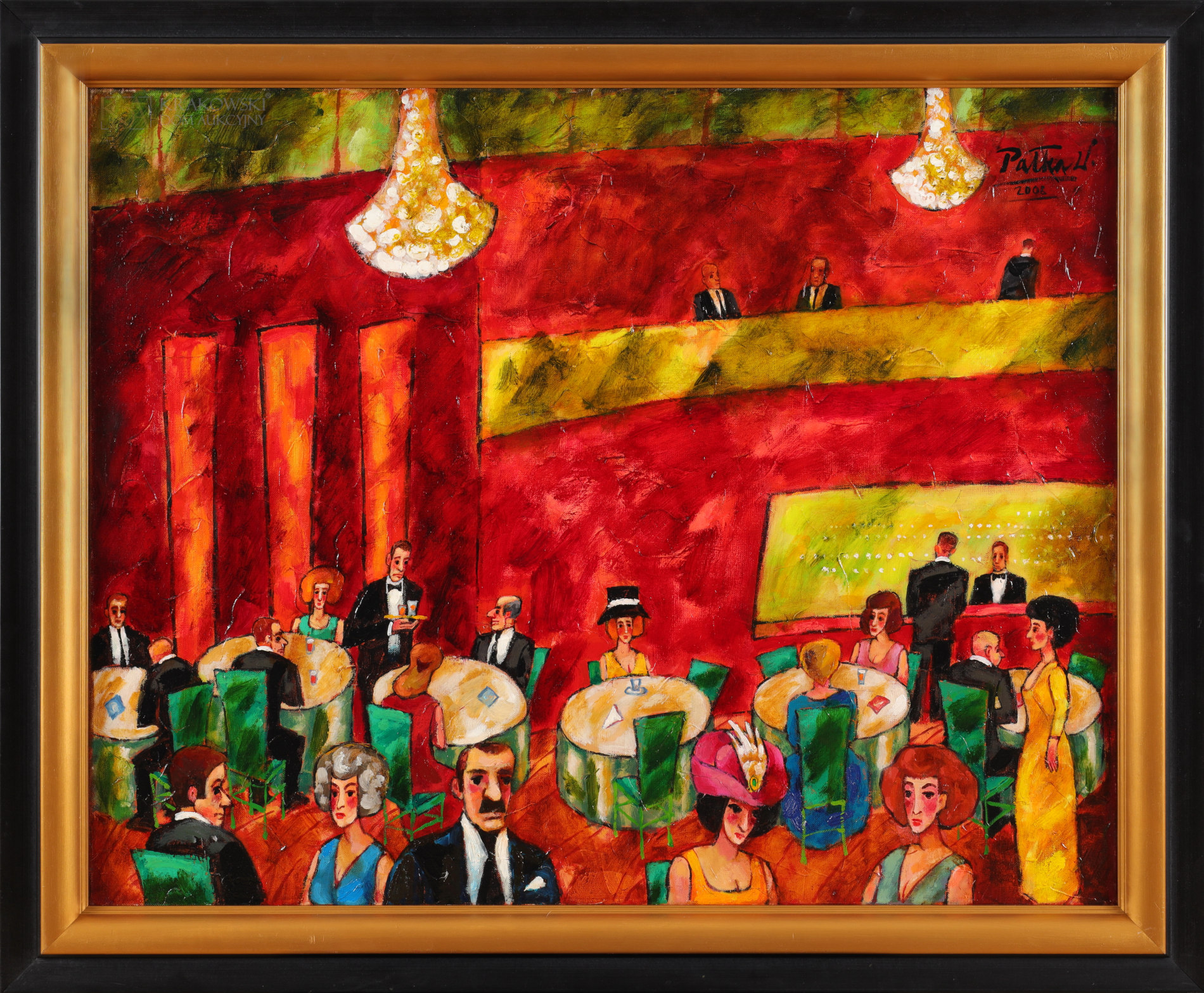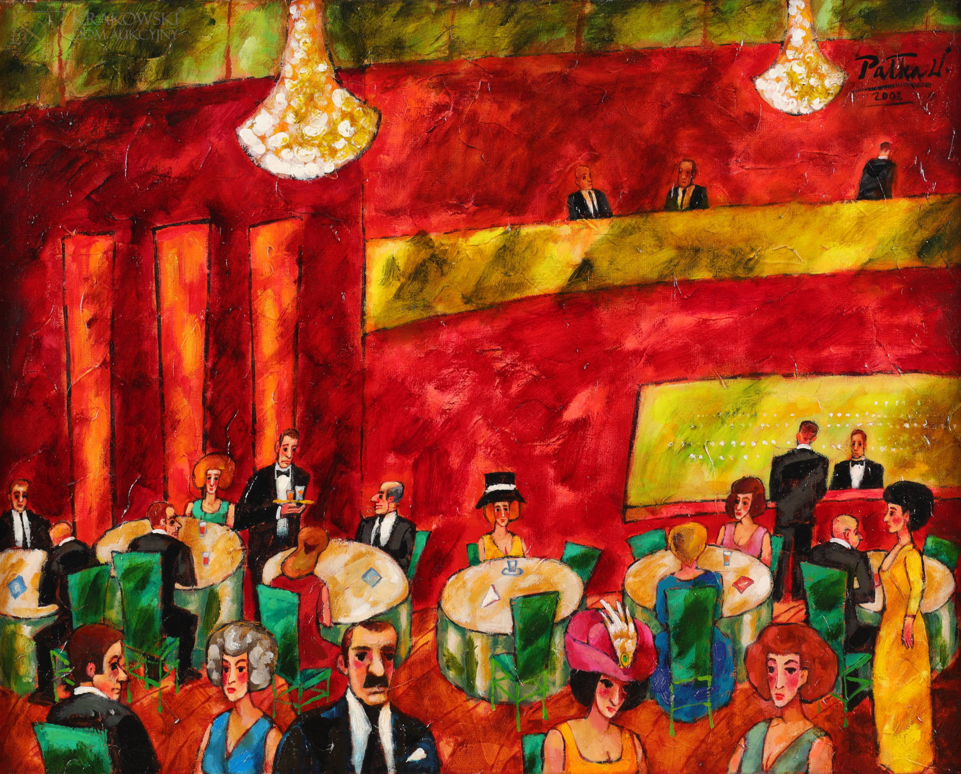 | Sygnowany i datowany p.g.: "Pałka W. | 2009" OPIS PRACY: Barwne malarstwo Witolda Pałki jest rozpoznawalne i pełne pozytywnej ekspresji. Artysta szczególnie chętnie uwieczniał wielopostaciowe sceny z rozrywkowych wydarzeń kulturalnych - balów, dansingów, koncertów. Prezentowany obraz ukazuje orkiestrę symfoniczną w trakcie wystąpienia. W lewym dolnym rogu jest widoczna sylwetka dyrygenta, który w dynamicznej pozie prowadzi działania muzyków. Przy dolnej krawędzi pola obrazowego widnieją sylwetki zasiadających w pierwszym rzędzie widzów. Całość rozgrywa się w wysokiej, eleganckiej sali o ciemnoczerwonych ścianach, z imponującymi przeszkleniami i zachwycającym bogactwem żyrandolem. W obrazie "Koncert" z 2009 roku obecne są charakterystyczne dla Witolda Pałki zabiegi formalne, takie jak intensywna, skontrastowana kolorystyka, wyraźny kontur, uproszczenie kształtów i bogata faktura malarska. | |