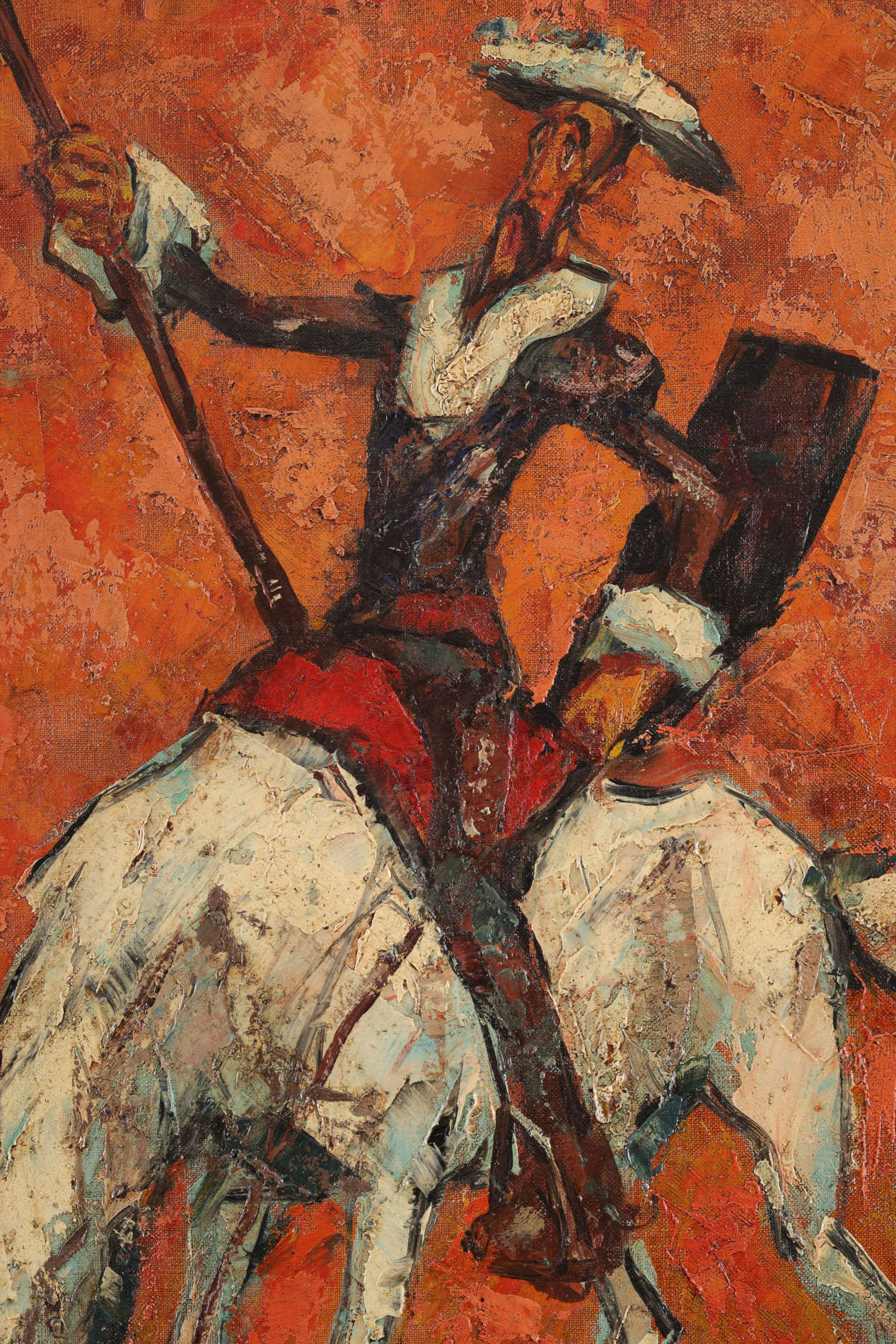 Cechy charakterystyczne twórczości Witolda Zacharewicza wyraźnie widoczne są w jego obrazie pt. "Walka". Praca przedstawia dwóch walczących ze sobą jeźdźców. Fizjonomia woja po lewej stronie wskazuje raczej na jego wschodnie pochodzenie. Kompozycja fakturowo malowanego dzieła jest niezwykle dynamiczna. Postacie walczących ukazane są w układzie zbliżonym do heraldycznego, co wprowadza elementy symetrii do pulsującego życiem obrazu. Wrażenie ruchu potęguje dodatkowo silnie wyczuwalny rytm i napięcie tworzone przez linie diagonalne. Warto zwrócić uwagę również na doskonałe wyczucie koloru, stopniowane odcienie brązów, żółci i szarości, które zostały umiejętnie rozłożone na całej powierzchni obrazu, korelując ze sobą i dając wrażenie harmonii, pomimo wyraźnej ekspresyjności obrazu i ukazania momentu napięcia. Widz zostaje jak gdyby wciągnięty do wnętrza dzieła poprzez wir ciemniejszych barw okalających scenę i musi sam dokończyć historię, decydując, który z wojowników zwycięży tytułową walkę.