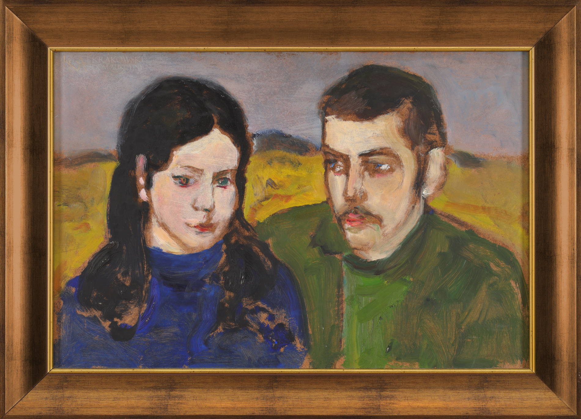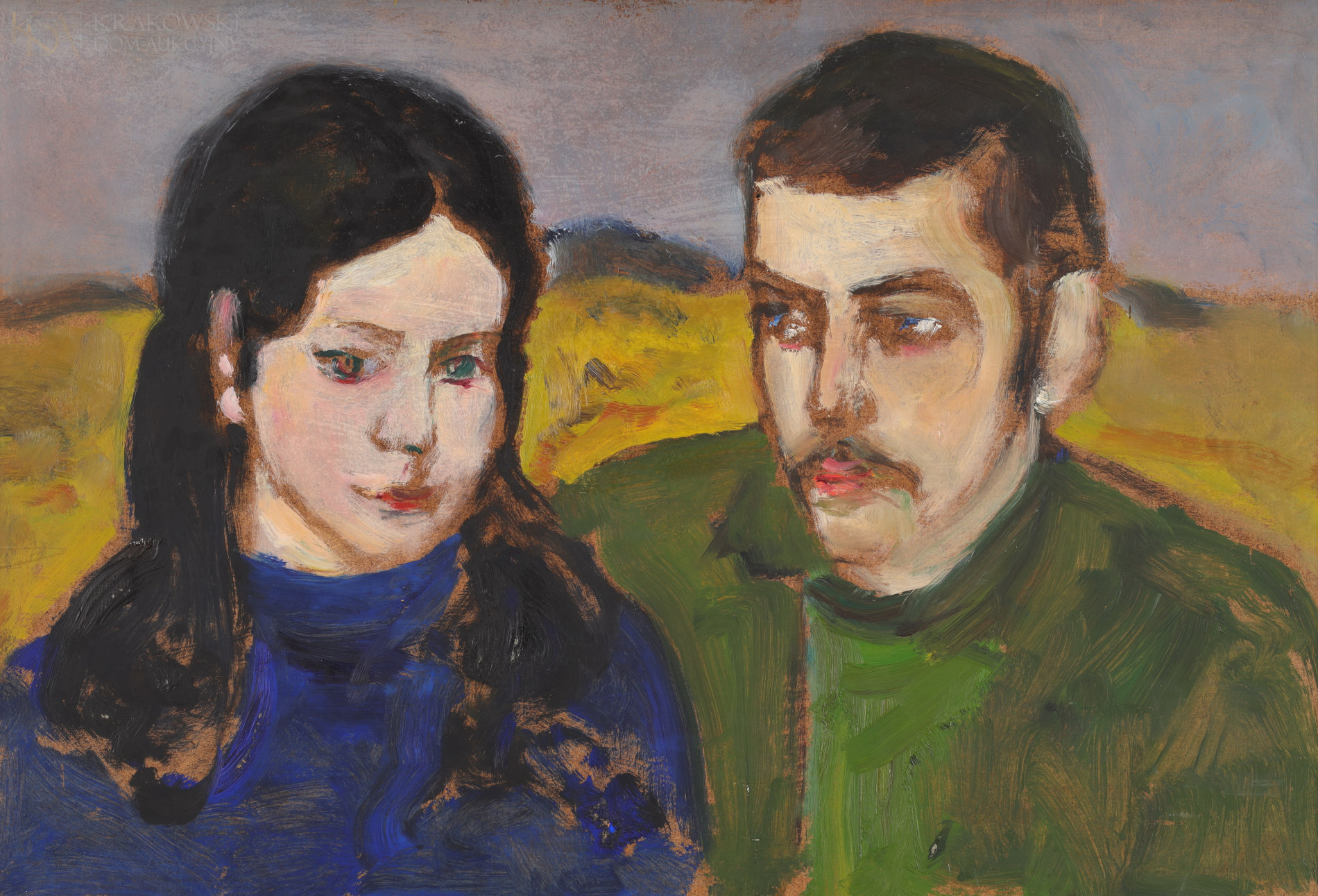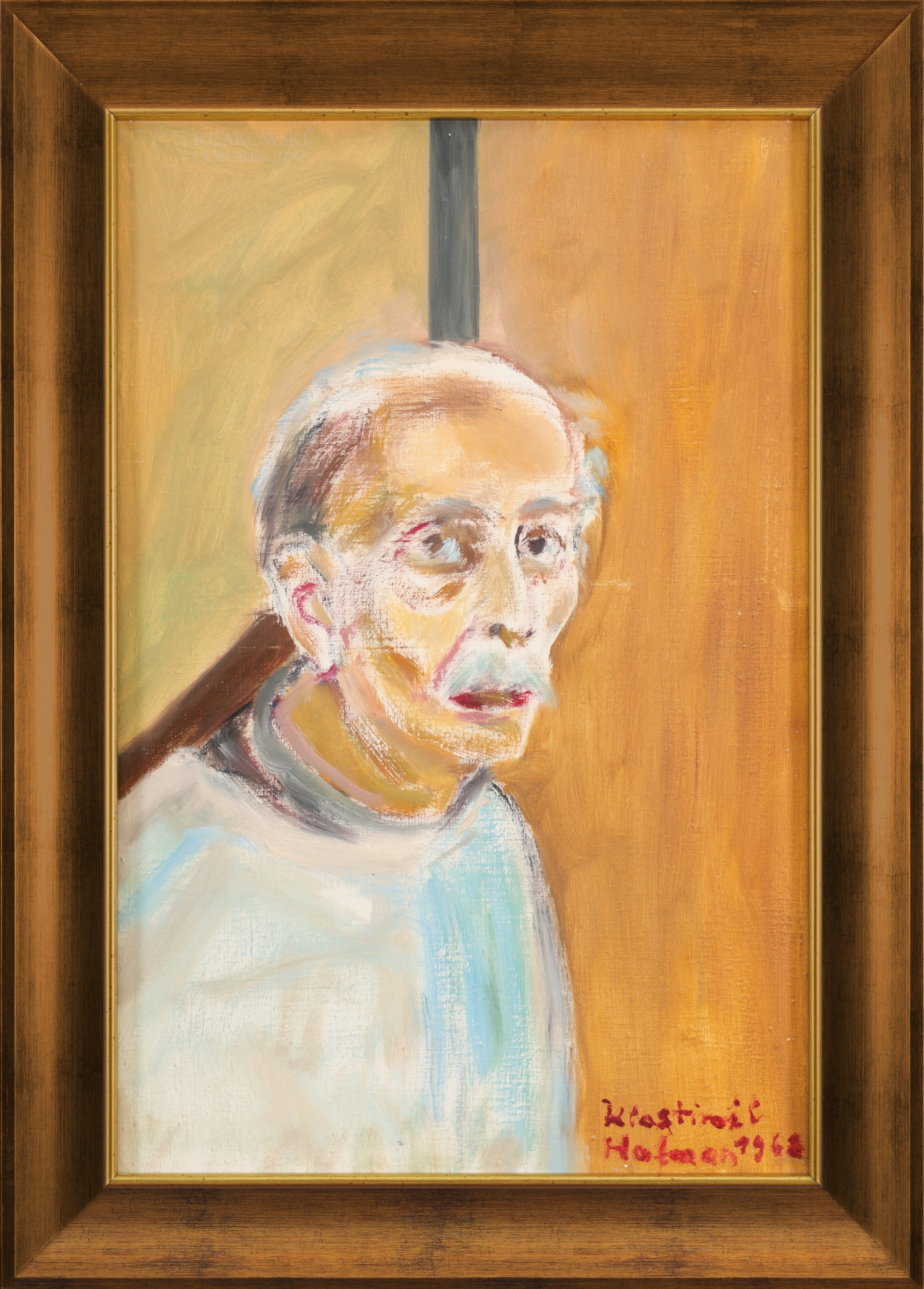 OPIS PRACY: Sztuka Wlastimila Hofmana była silnie osadzona w nurcie malarstwa symbolicznego, dzięki czemu prace artysty często kryją w sobie złożone treści. Prezentowany autoportret pochodzi z ostatnich lat życia artysty. W tym okresie Wlastimil Hofman zmagał się z pogarszającym się stanem zdrowia i śmiercią ukochanej żony, tym samym wizerunek własny można interpretować jako personifikację smutku i bólu. Obraz w swojej formie jest ekspresyjny i operuje wąską gama barwną. Praca wpisuje się w niezwykle złożony cykl autoportretów malarza, które powstawały już w wczesnym okresie aktywności twórczej Wlastimila Hofmana. | |