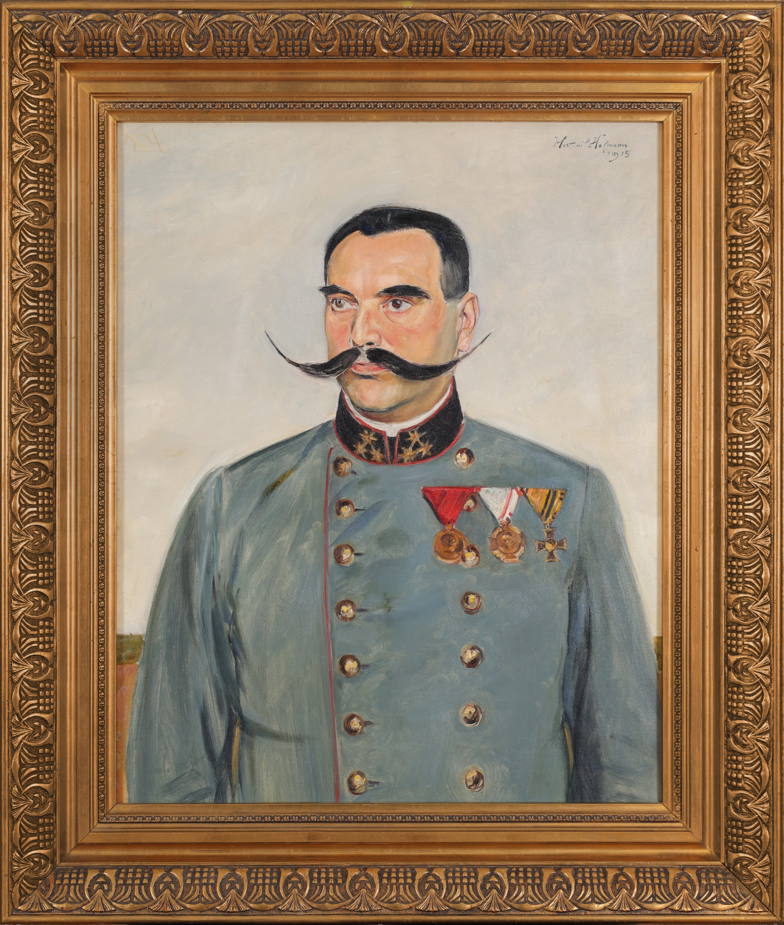 | Sygnowany i datowany p.G.: "Vlastimil Hofmann | 1915" Na blejtramie pieczęć praskiego sklepu z przyborami malarskimi Ludvíka Císařa. OPIS PRACY: Wlastimil Hofman, choć znany głównie z symbolicznych scen o melancholijnej nastrojowości, był również sprawnym portrecistą. Oferowane płótno pochodzi z drugiej dekady XX wieku - jednego z najbardziej cenionych okresów twórczości Wlastimila Hofmana. Czas powstania wpływa też na odmienną od późniejszych sygnaturę - w roku 1915 artysta jeszcze podpisywał się czeskim, niespolszczonym imieniem i nazwiskiem, jako Vlastimil Hofmann. Obraz stanowi reprezentacyjny, półpostaciowy portret oficera armii Austro-Węgier, pełniącego w służbie zawód lekarza pułkowego (Regimentsarzt). O randze żołnierza świadczy jego mundur oraz patki kołnierzowe. Na lewej piersi mężczyzny widnieją trzy odznaczenia wojskowe, stanowiące kolejno Medal Jubileuszowy Pamiątkowy dla Sił Zbrojnych i Żandarmerii, Krzyż Jubileuszowy Wojskowy oraz Krzyż Pamiątkowy Mobilizacji 1912-1913. Elementy te oddane zostały przez artystę z należytą starannością, dzięki której są identyfikowalne. | |